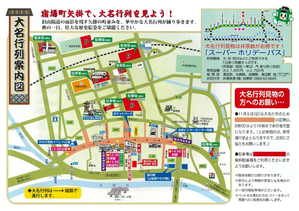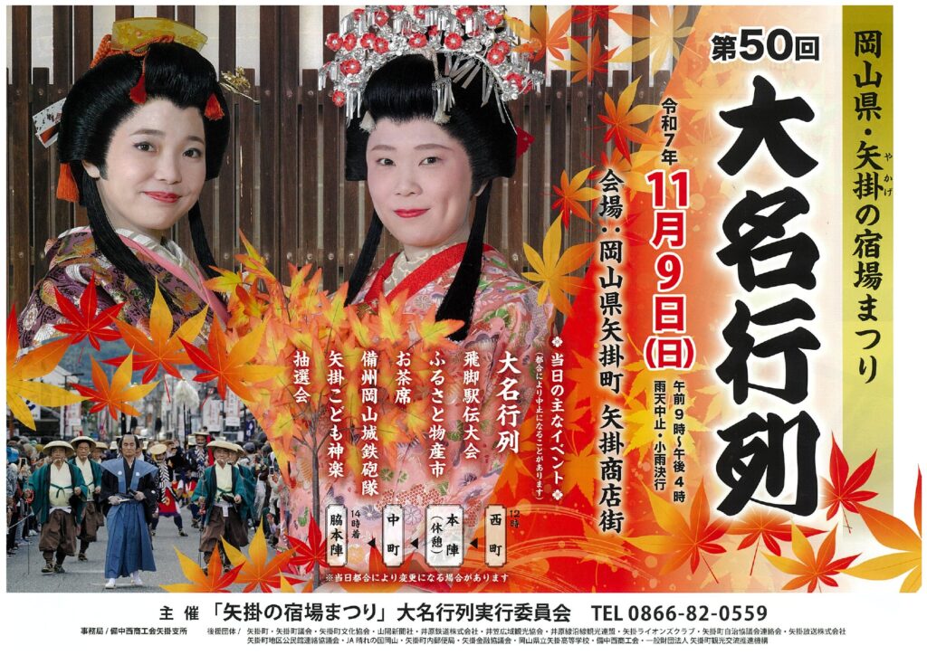 大名・公卿・幕府役人など身分の高い者が宿泊した 〝本陣″ と、本陣の予備の宿泊施設 〝脇本陣" の両方が現存している、旧山陽道矢掛宿で繰り広げられる時代絵巻「大名行列」は、毎年11月第2日曜日(2025年は11月9日)に開催されます。